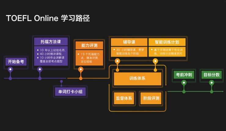 用户进入朗播的智能英语学习系统后,系统会结合其学习目标以及备考时间,继而为其提供个性化精准学习方案的一站式学习解决方案。以朗播托福智能学习系统为例,产品包含:托福学习方法课+自适应学习系统+线上监督辅导服务。用户真实的学习路径如下: