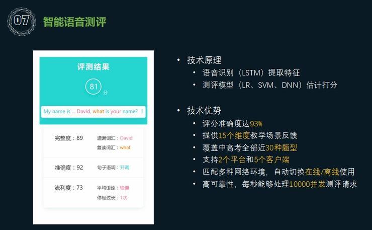 经过前期的不断积累和对算法的持续优化,现阶段流利说在口语评测、语音识别、自然语言处理、深度学习等方面都取得了非常大的突破。(具体技术细节详见《2018AI自适应教育行业研究报告》)