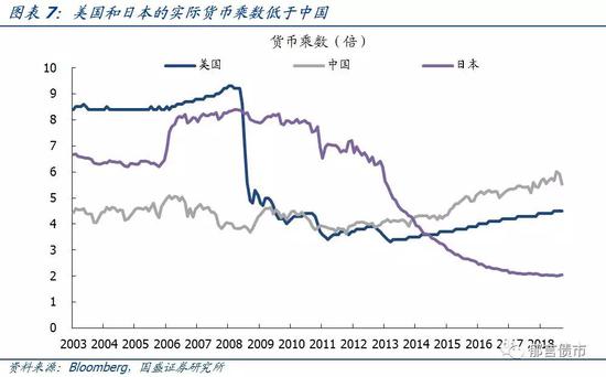 信用派生方面,低准备金率并不等价于高货币乘数。美国、日本的法定准备金率要远低于中国,美国不同金融机构准备金率分别为0、3、10%,日本的准备金率为0.8%。但意外的是,2015年以来,美国和日本的实际货币乘数反而低于中国。由于理论货币乘数可以简化为法定准备金率的倒数,可见实际的货币乘数并没有达到理论上限。原因就在于理论上的货币乘数,需要信用充分扩张才能达到。