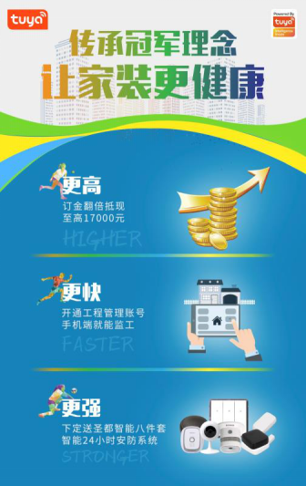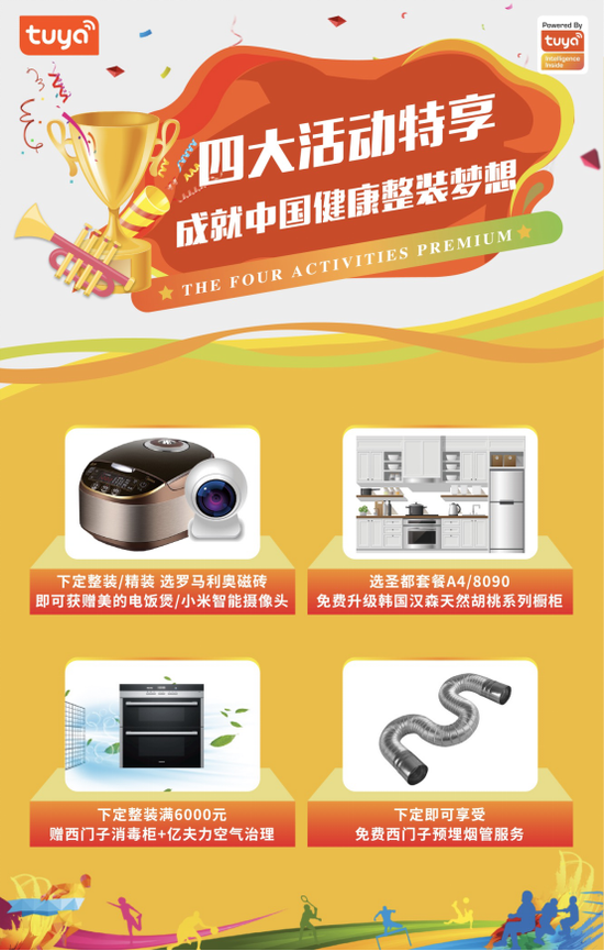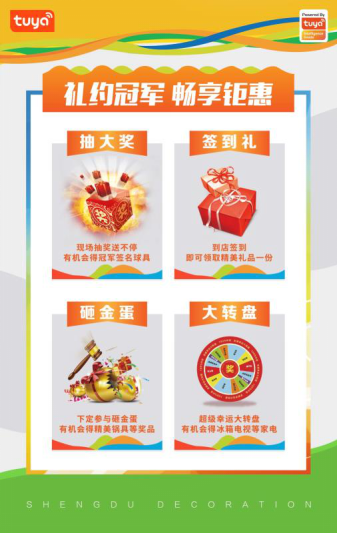 除了便捷装修模式,活动现场比夏季更火热的是装修优惠。业主到场签单即可获赠精美礼品,下定整装产品即送由涂鸦智能赋能的圣都智能安防八件套,并免费获得西门子预埋烟管服务,网线、电视线、电话线、电线、木工板等材料免费升级。交5000元定金最高直抵17000元工程款,交6000元订金即可获赠健康礼包:西门子消毒柜+亿夫力空气治理服务,还可参与砸金蛋、转盘抽家电、抽冠军签名球具等活动。同时,业主还可享受软装包特价5.5万元优惠享,若选择罗马利奥磁砖,客餐厅使用达30㎡以上,即赠美的电饭煲一台,全屋空间(客餐厅+玄关+过道+厨房+卫生间+阳台)均使用罗马利奥磁砖,再赠涂鸦赋能的智能摄像头一台。